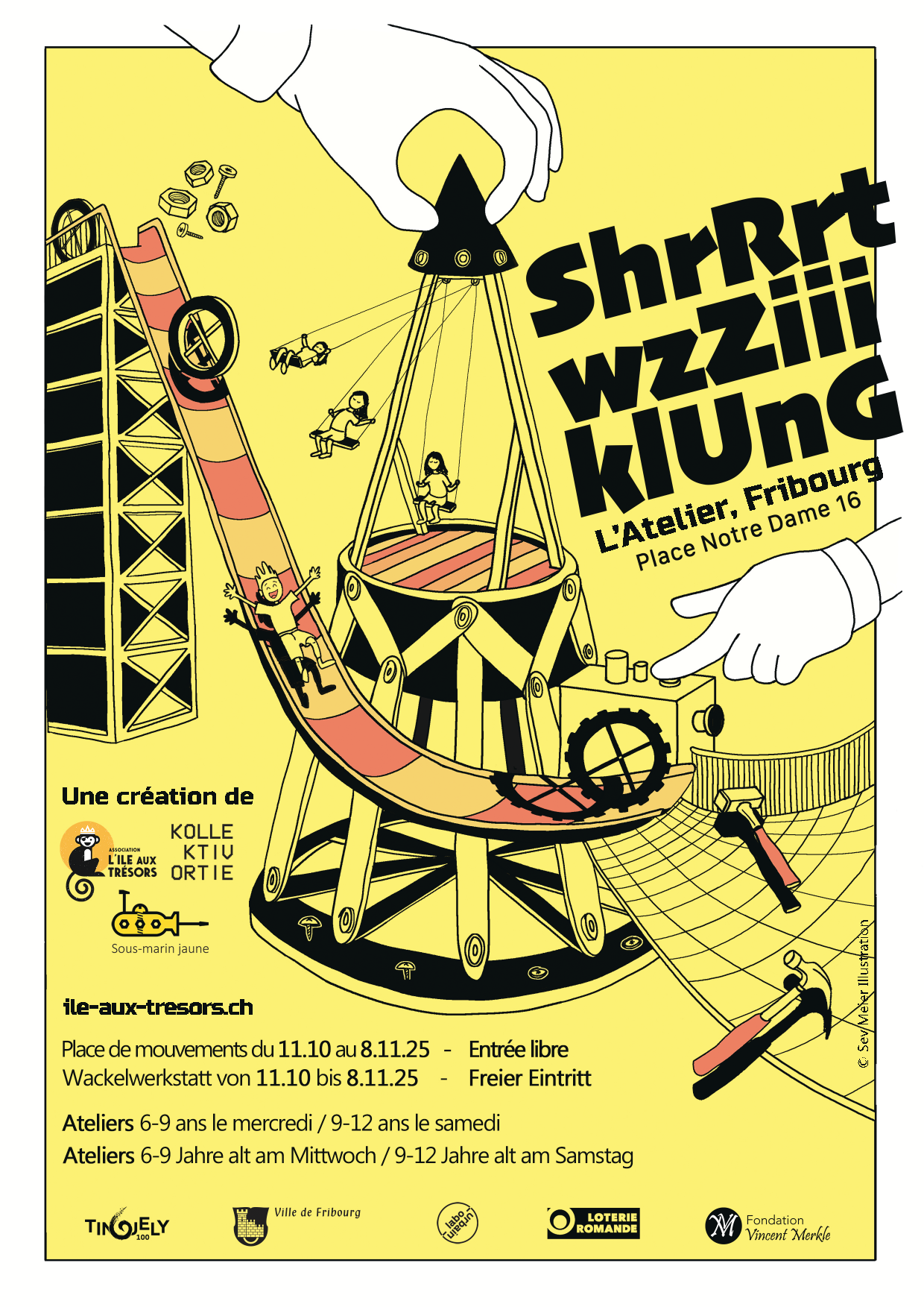 Die Vereine L’île aux trésors, Le Sous-marin Jaune und Le Kollektiv Ortie präsentieren ihr Projekt: ShrRrt wzZiii klUnG. Ein seltsamer Name? Es handelt sich um einen Klang, eine Hommage an Jean Tinguely, der von Geräuschen und Klängen fasziniert war.