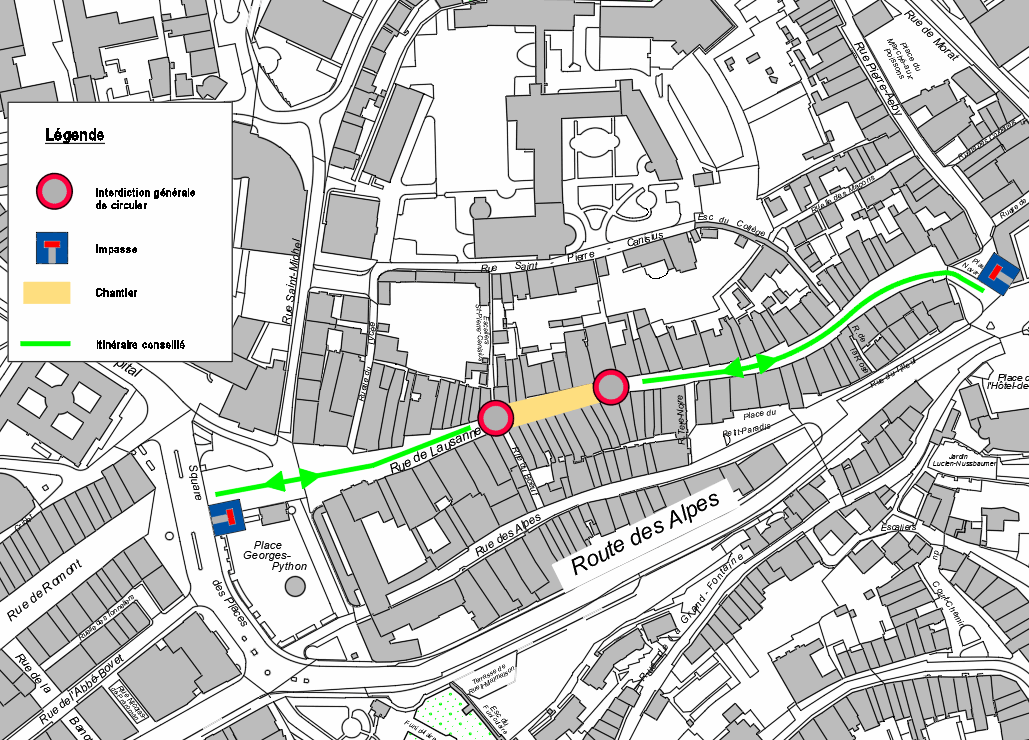 - Rue de Lausanne en impasse de part et d'autre. Fermeture de la rue en fonction du positionnement du camion nacelle.