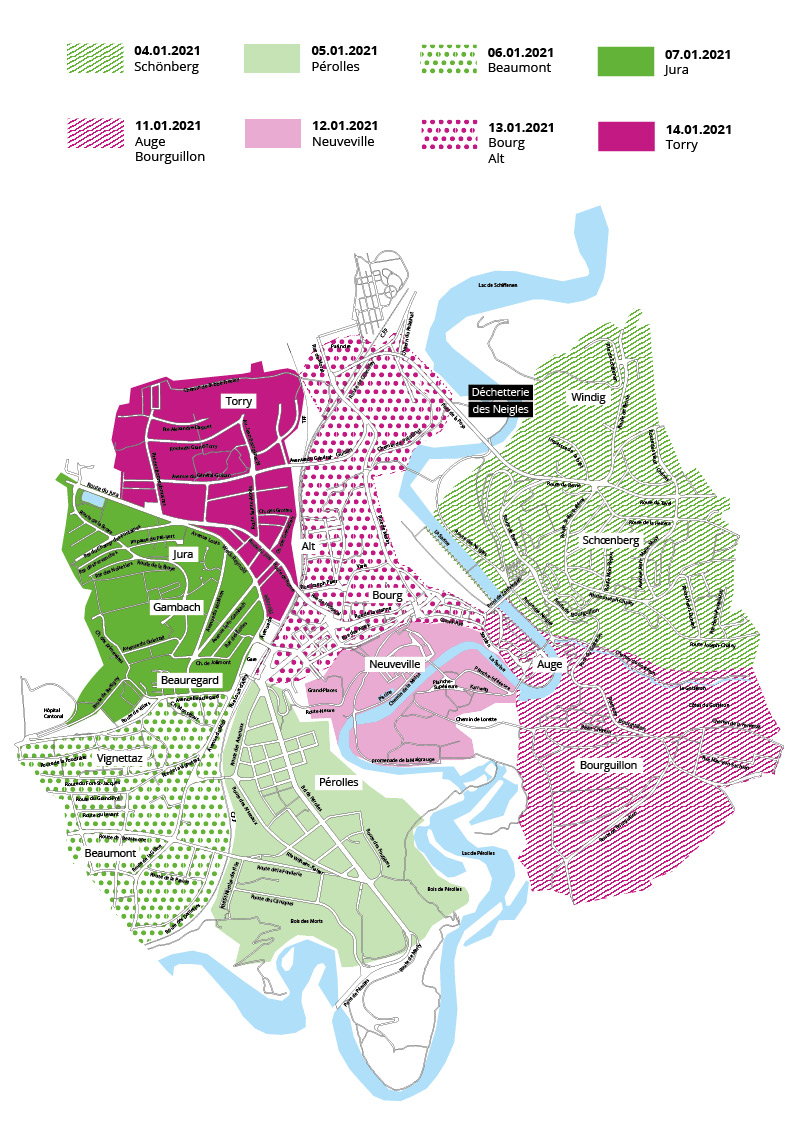 Les passages s’organiseront comme suit : Schoenberg (04/01), Pérolles (05/01), Vignettaz/Beaumont (06/01) et Jura (07/01). Puis, Auge/Bourguillon (11/01), Neuveville (12/01), Bourg/Alt (13/01) et finalement Torry (14/01).