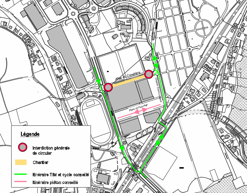 Allée du Cimetière fermée aux piétons. Transit possible par la place du Fair-Play.