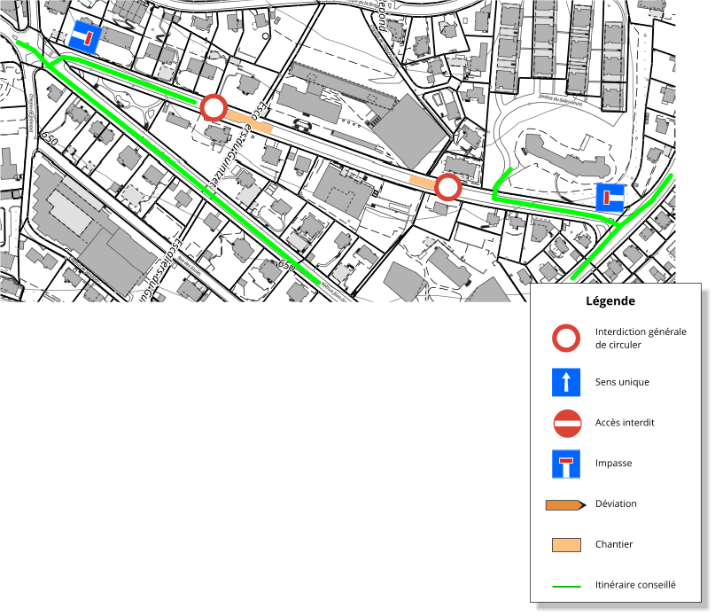 - Av. du Moléson en impasse des deux côtés. Fermeture de la route entre le No 4 et le No 12.