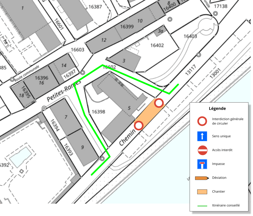 - Ch. de la Motta fermé au niveau du bâtiment Petites-Rames no 5 . Déviation par les Petites-Rames.