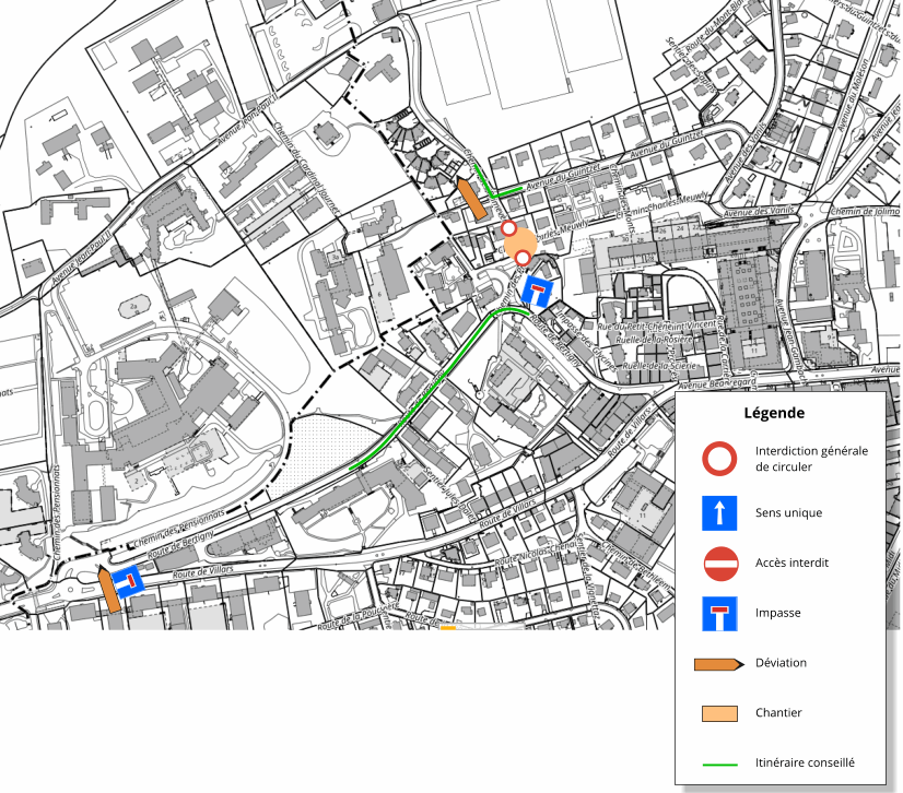 - Chemin des Primevères fermé au niveau du chemin Charles-Meuwly. Accès en impasse des 2 cotés. Déviation par Av. Jean-Paul II.