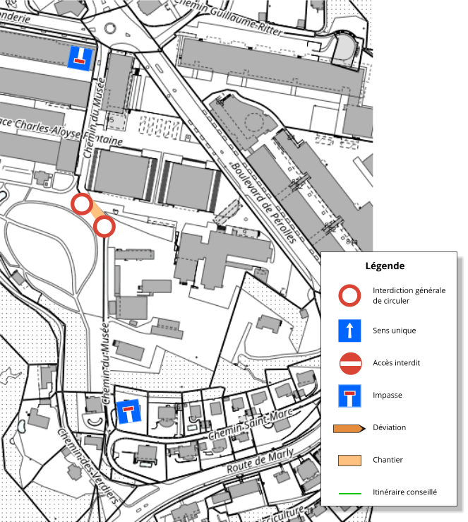 Ch. du Musée fermé au niveau du bâtiment no 6. Accès en impasse des deux côtés.