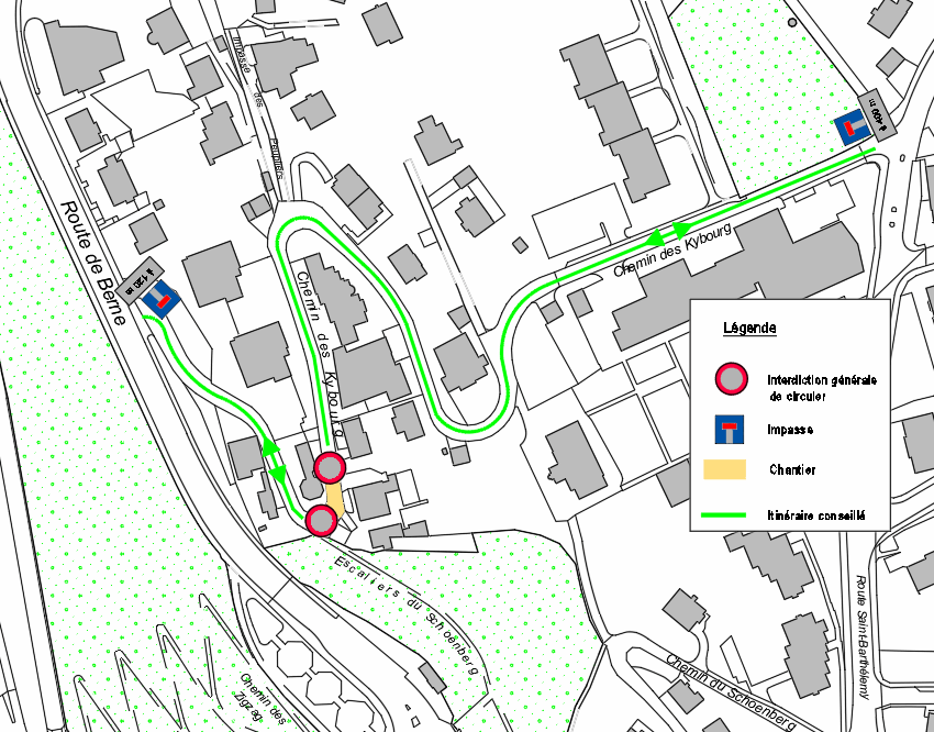 - Chemin des Kybourg fermé au niveau du No 6. Accès en impasse de part et d'autre.