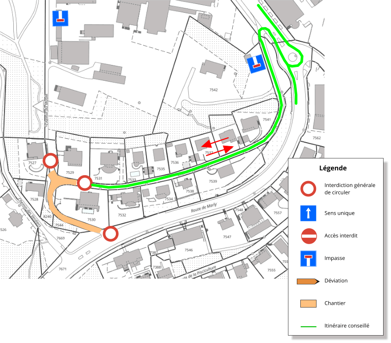 - Chemin Saint-Marc en impasse, circulation possible dans les deux sens. La sortie des véhicules pourra se faire par le giratoire de la Pisciculture