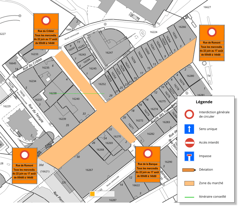 Restriction de circulation - Marché Rue de Romont - Rue du Criblet, tous les mercredis de 5h à 14h du 22.06 au 17.08 (y compris)