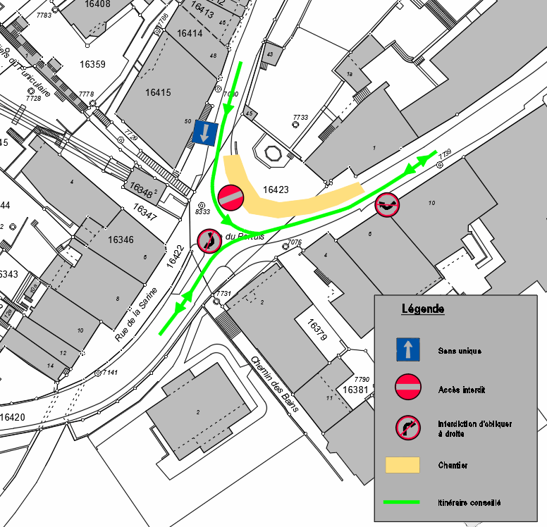 - Rue de la Grand-Fontaine en sens-unique descendante. Interdiction d'obliquer à droite depuis la rue de la Neuveville sur la rue de la Grand-Fontaine.
