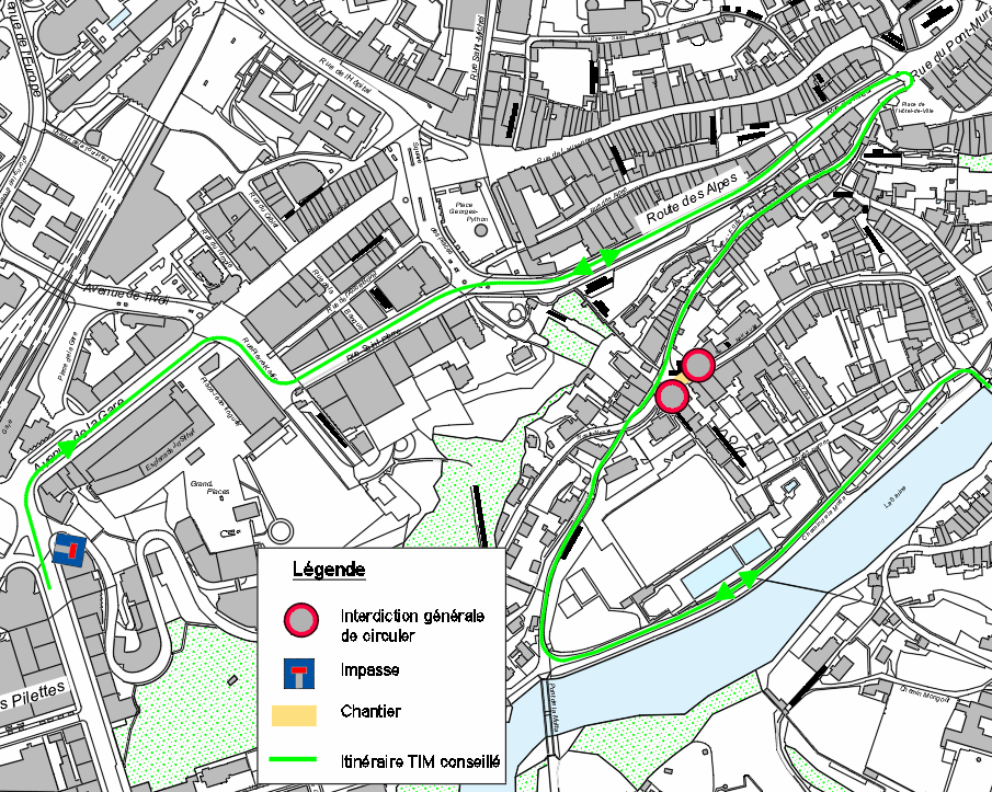 - Route-Neuve fermée au droit de la place du Pertuis. Accès en impasse depuis le boulevard de Pérolles. Accès à la Basse-Ville par la rue de la Grand-Fontaine et la rue de la Sarine.
