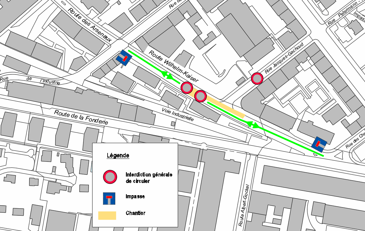 - Rte Wilhelm-Kaiser fermée au droit du carrefour avec la rue Jacques-Gachoud. En impasse de part et d'autre. Accès au parking du n° 10 garanti du côté Marly.