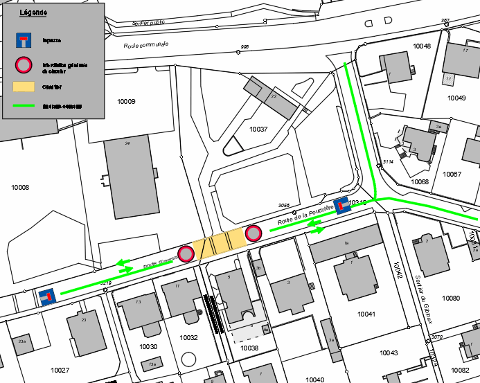 Route de la Poudrière mise en impasse des deux côtés au niveau du No 5. Passage des piétons garantie.