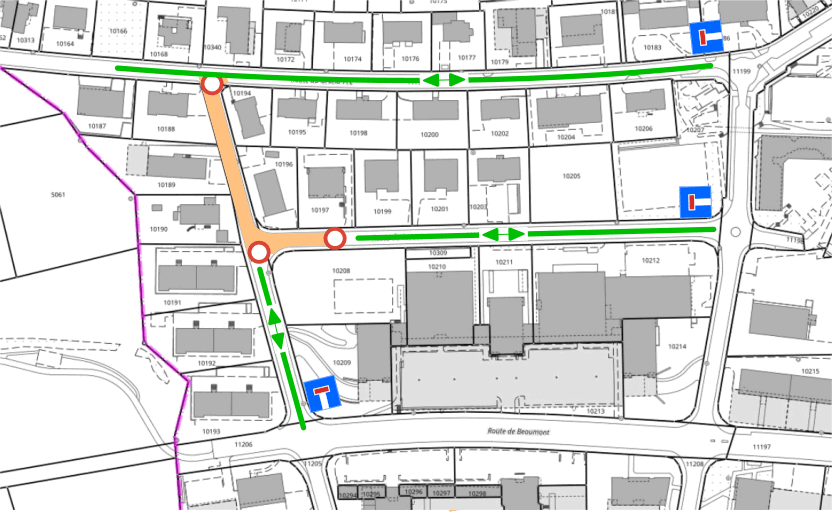 Rte de la Veveyse fermée entre la rte du Levant et la rte du Grand-Pré. Rte du Grand-pré et rte du Levant, accès en impasse depuis la rte de la Gruyère. Rte de la Veveyse, accès en impasse depuis la rte de Beaumont.