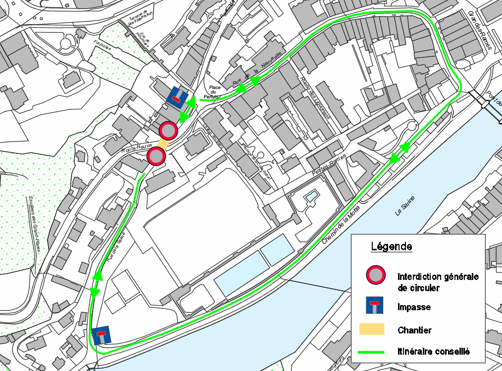 - Rue de la Sarine fermée au niveau du passage inférieur. Accès en impasse depuis le chemin de la Motta et depuis la place du Pertuis.