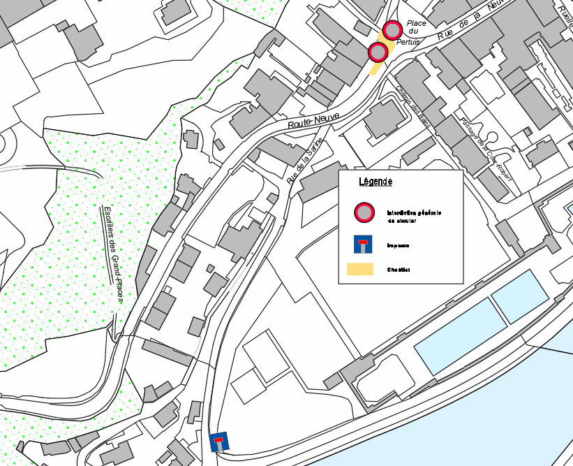 Rue de la Sarine fermée au niveau de la place du Pertuis. Accès en impasse depuis le chemin de la Motta.