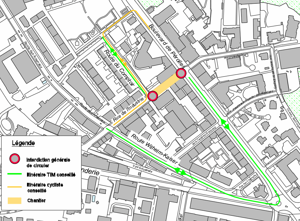 - Rue de l'Industrie fermée entre la route du Comptoir et le boulevard de Pérolles. Déviation par la route Wilhlem-Kaiser, route de la Fonderie, boulevard de Pérolles.