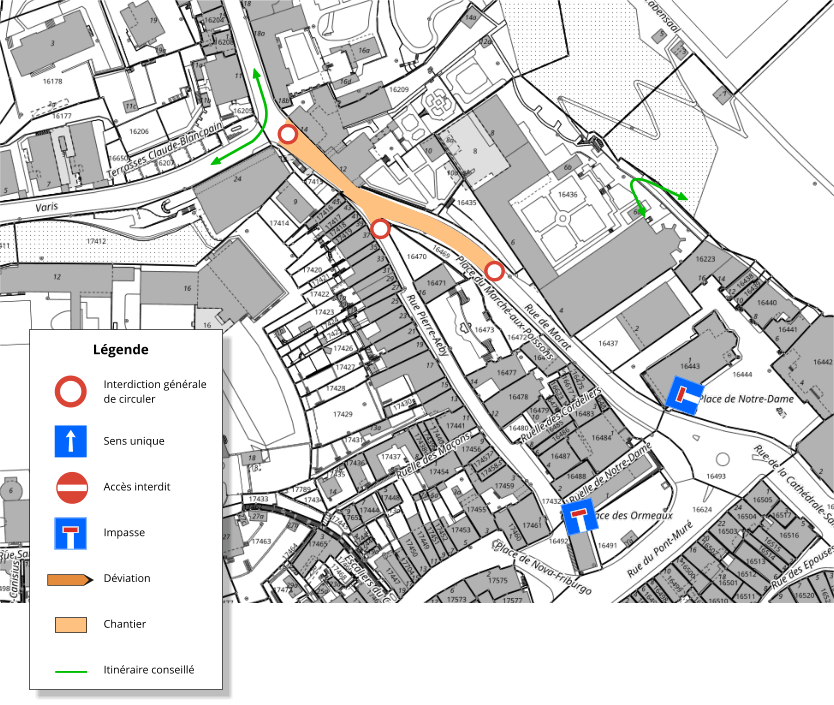 - Rue de Morat fermée entre le Varis et la ruelle Notre-Dame. Déviation par l’av. Général-Guisan et le Varis. Rue Pierre-Aeby, accès par la pl. Nova-Fribourgo.