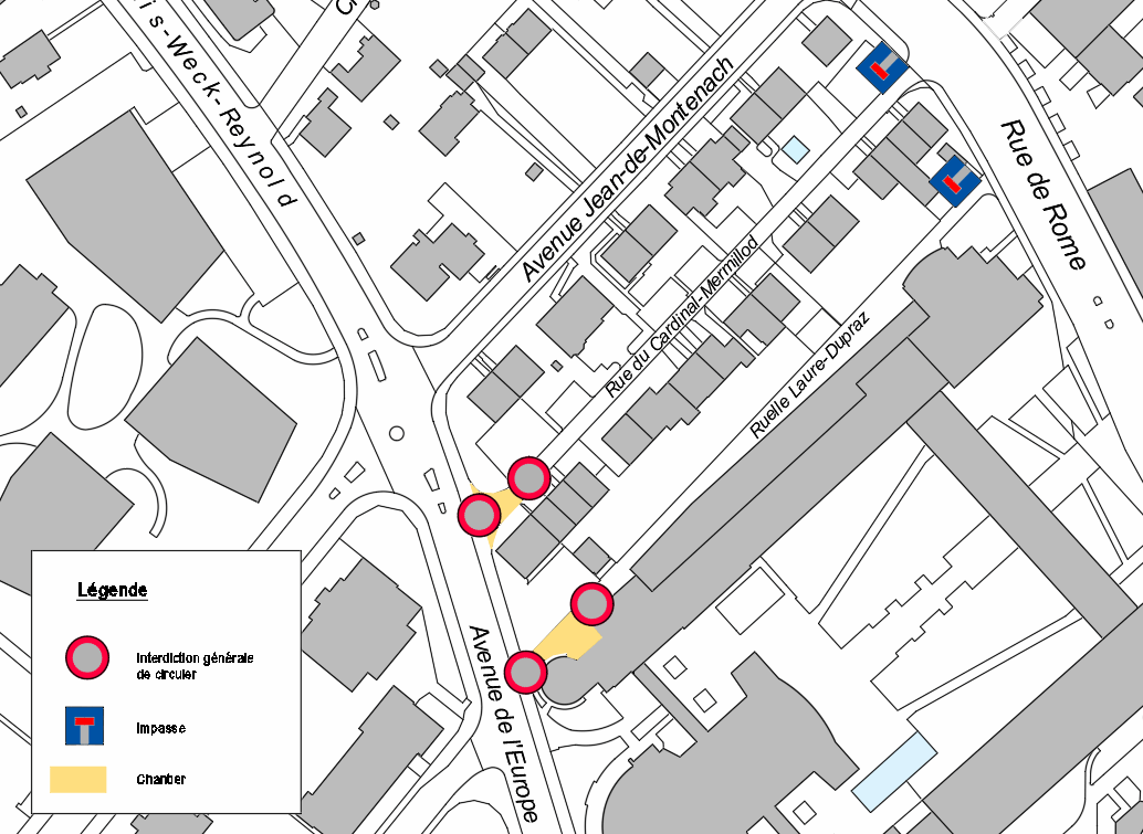Rue du Cardinal-Mermillod et ruelle Laure-Dupraz fermées au droit de l'Av. de l'Europe. Accès par la rue de Rome.