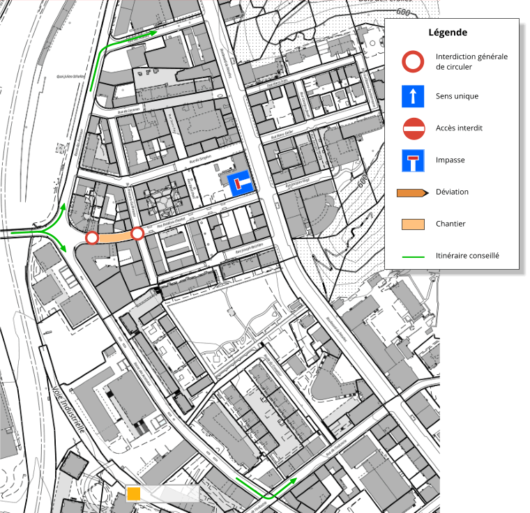 Rue Frédéric-Chaillet fermée entre la rte des Arsenaux et la rue Guillimann. Déviation par la rue des Pilettes ou la rue de l’Industrie. Accès rue Chaillet par le bd de Pérolles.