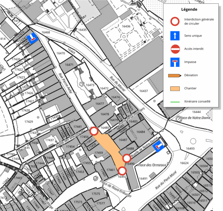 - Rue Pierre-Aeby fermée depuis la ruelle des Maçons jusqu’à la pl. Nova-Fribourgo. Accès en impasse depuis la rue de Morat.