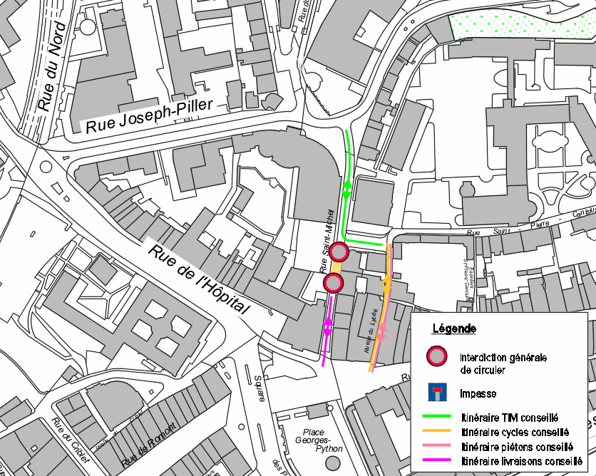 - Rue St-Michel fermée entre le café du Populaire et la rue de Lausanne, selon l'avancement des travaux. Accès à la rue St-Pierre-Canisius par Jospeh-Piller / Varis.