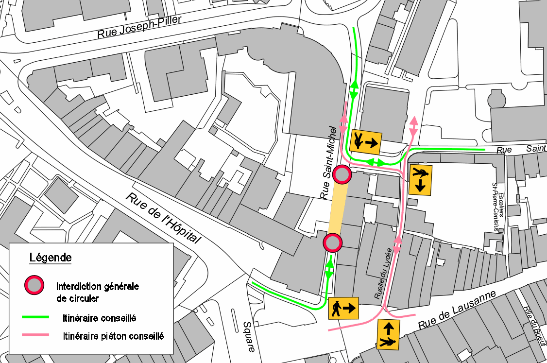 - Rue St-Michel fermée au niveau du Café du Populaire. Déviation par la ruelle du Lycée. Accès aux bâtiments garantis.
