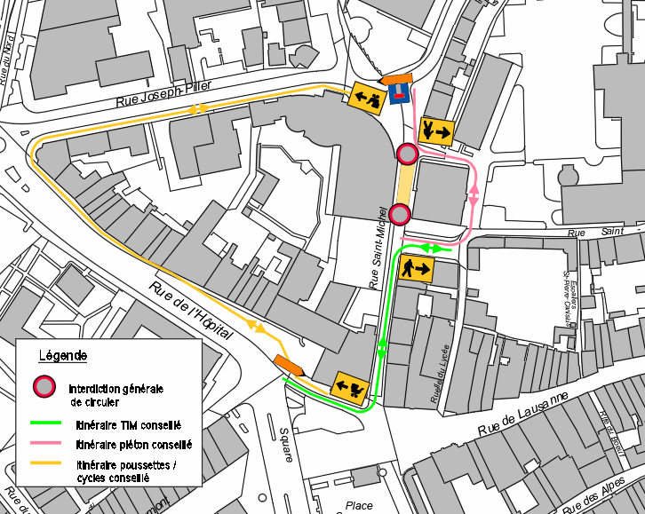 Rue St-Michel fermée au niveau du Varis. Accès autorisé par la rue de Romont/Square des Places.