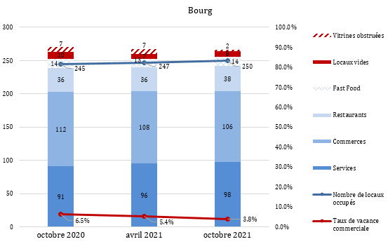 Dans le quartier du Bourg, on dénombre 260 espaces, dont 250 occupés, soit un taux de vacance de 3.8% en baisse de 2.2 points par rapport à avril 2021 et de 9.7 points par rapport à la première analyse datant de 2018. 39.2% de ces espaces sont occupés par des services, 42.4% par des commerces et 20.8% par des restaurants, dont 26.9% de fast-foods.