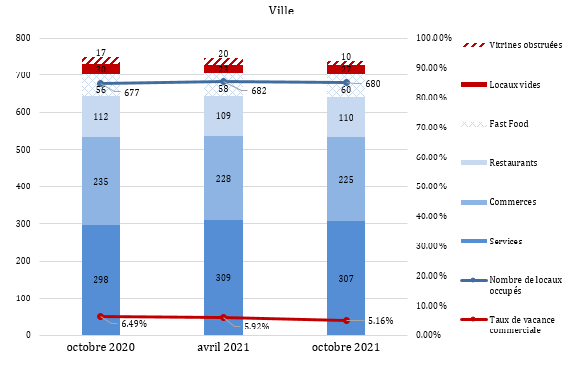 717 espaces commerciaux ou administratifs sont présents dans la zone étudiée, définie par le Plan d'aménagement local (Plan du Dosage des Fonctions), qui représente la majorité des rues commerçantes de la ville. 680 de ces espaces, soit 94.8%, sont occupés. 45.1 % d’entre eux le sont par des services, 33.1% par des commerces, et 25% par des restaurants. 35.3% de ces restaurants sont quant à eux des fast-food et/ou take-away. Le taux de vacance s'élève donc à 5.2%, en baisse de 0.7 points par rapport à avril 2021 et de 10.3 points par rapport à la première analyse datant de 2018, ce qui est très proche de l'équilibre conjoncturel de 5%. Par rapport au précédent relevé, on constate une hausse du nombre de fast-foods, qui pourrait s'expliquer par un changement des habitudes de consommation lié à la pandémie de Covid-19.