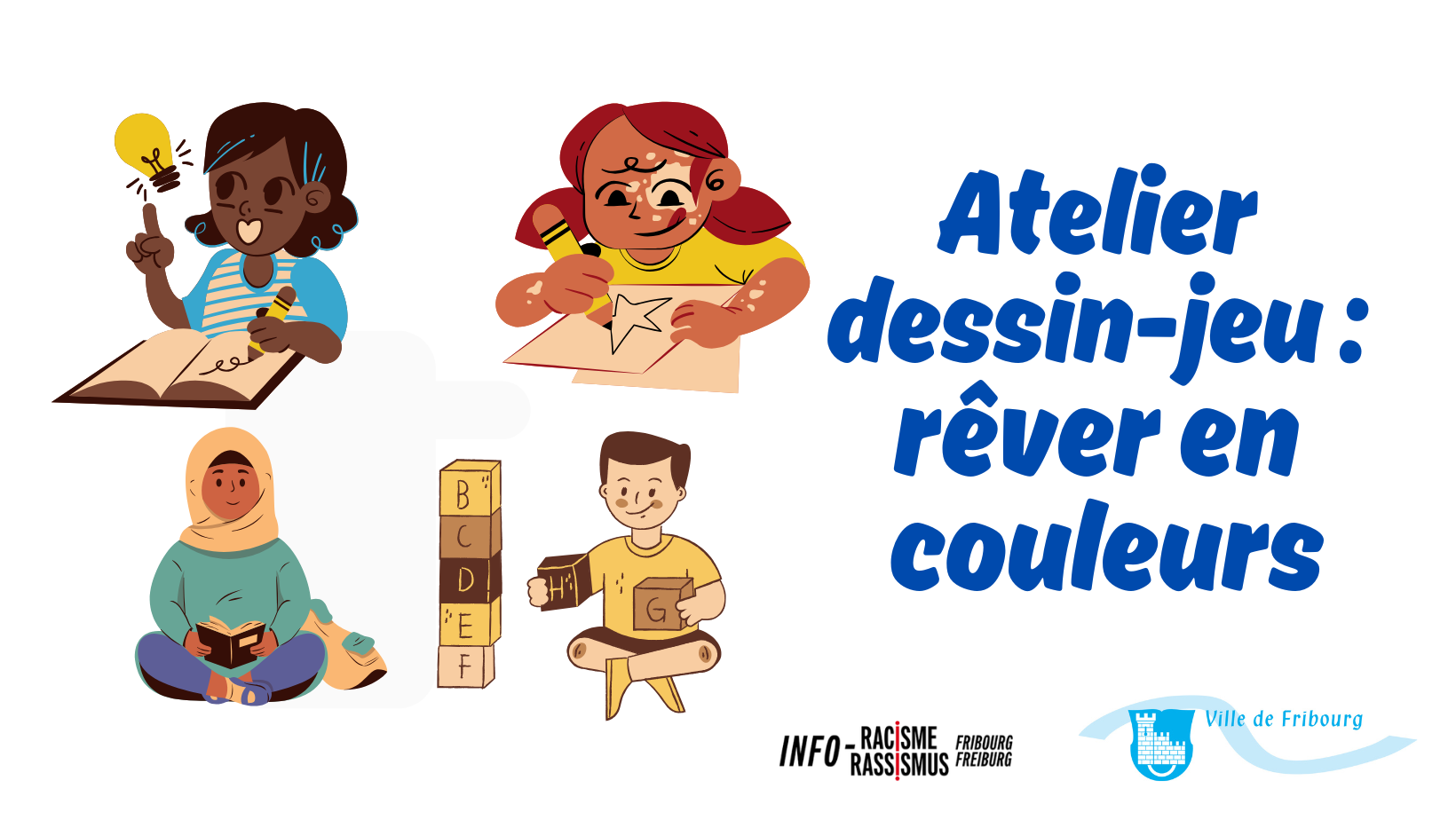 De quelle couleur est ta peau ? Rose, brun clair ou brun foncé? Il existe mille et une nuances de couleurs, mais on n’a pas toujours l’habitude de les voir quand on dessine, on joue ou on lit. Viens expérimenter différentes techniques créatives pour tester ces couleurs et voir ce que ça change dans les dessins et dans les livres. Pour rêver à un monde qui représente tout le monde ! Goûter offert. De 15:00 à 17:00 des activités sont en libre-accès sur ce thème-là. En collaboration avec le Service Info-Racisme Fribourg, dans le cadre de la Semaine d’actions contre le racisme.