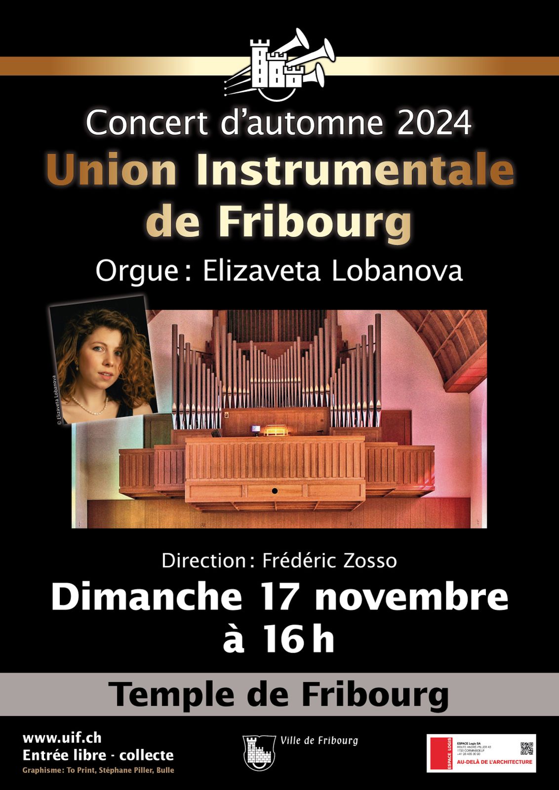 Concert de l'Union Instrumentale de Fribourg avec orgue, dimanche 17 novembre 2024, à 16 heures, au Temple réformé de Fribourg.