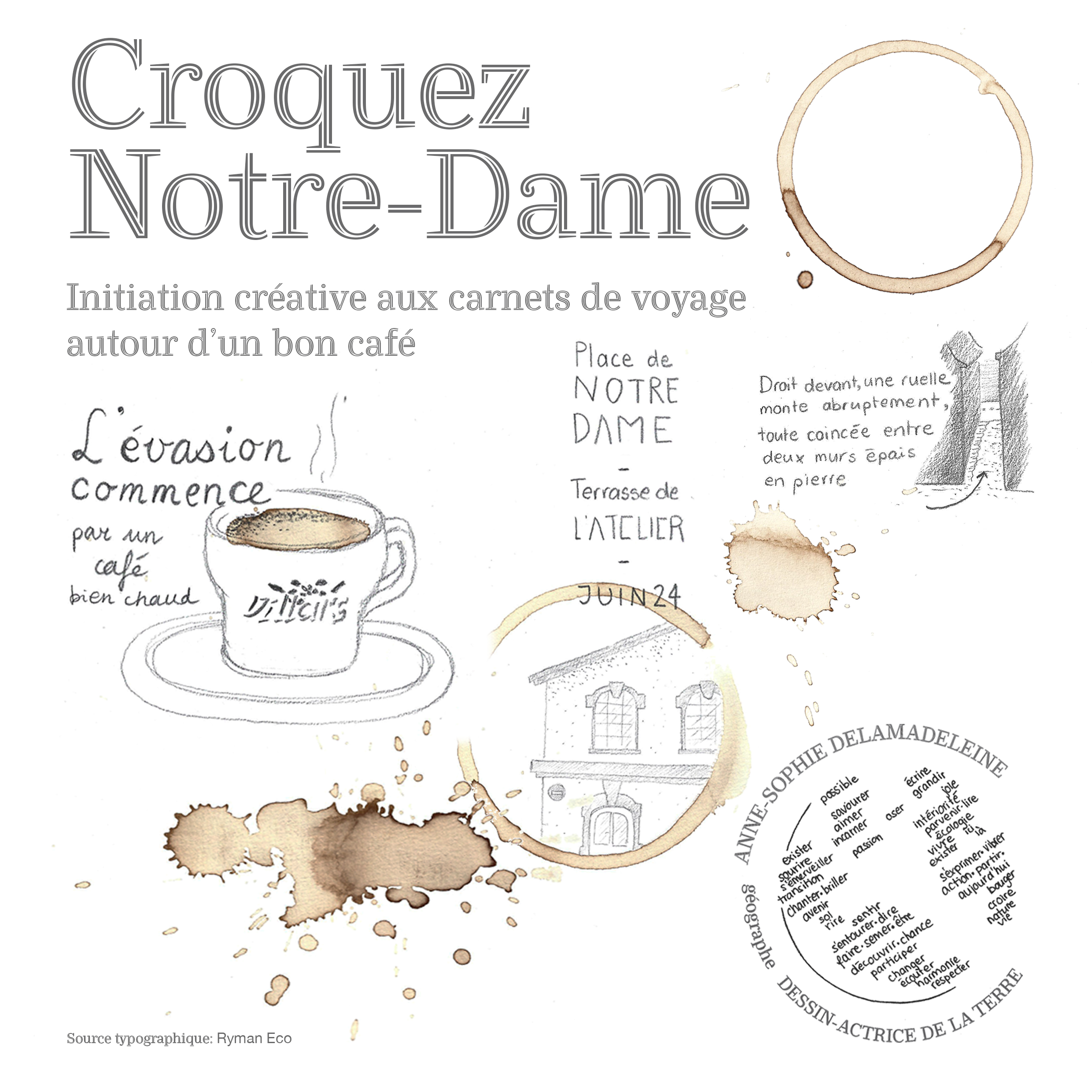 « Croquez Notre-Dame » est une initiation créative aux carnets de voyage autour d’un bon café, qui se déroule sur la terrasse d'été de L'Atelier.