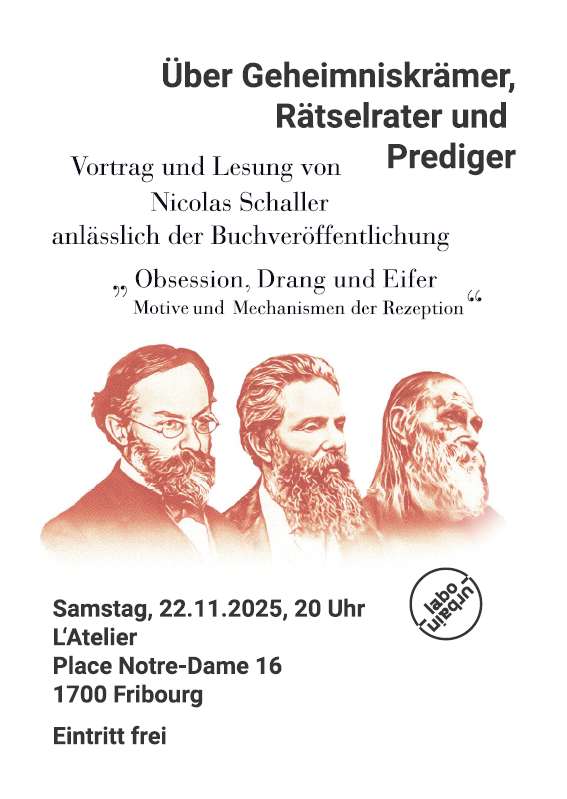 Le 22 novembre 2025, à L’Atelier, à Fribourg, l’auteur parlera de lectrices et lecteurs rétifs, de gardiens de secrets sans secret, d’herméneutes acharnés et de philosophes animés d’un zèle missionnaire – et expliquera pourquoi il a choisi de consacrer un livre à ces figures et à leurs élans.