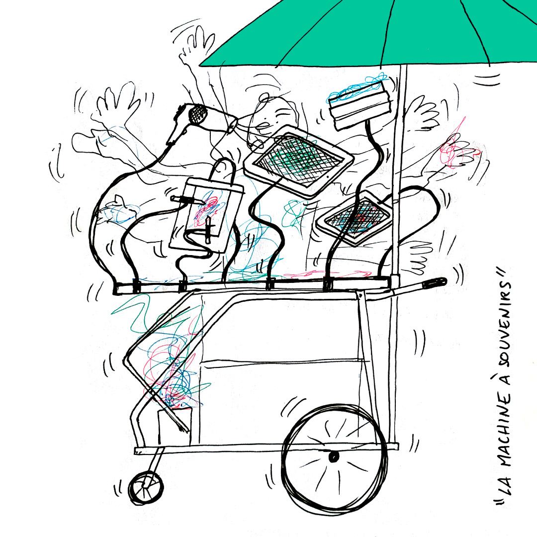 « La machine à souvenirs » a été pensée comme le stand itinérant de « merchandising » du centenaire de Jean Tinguely: de petites œuvres inédites, des produits dérivés et des souvenirs à emporter seront produits sur place grâce à une étrange machine ludique et interactive. À l'heure de l'uber-digitalisation, de l'I.A. et des high-tech, la machine à souvenirs rend hommage à la naïveté et à la sobriété d'une machine simple et poétique, un peu maladroite, qui n'existe pas pour la performance mais plutôt pour le mouvement en soi.