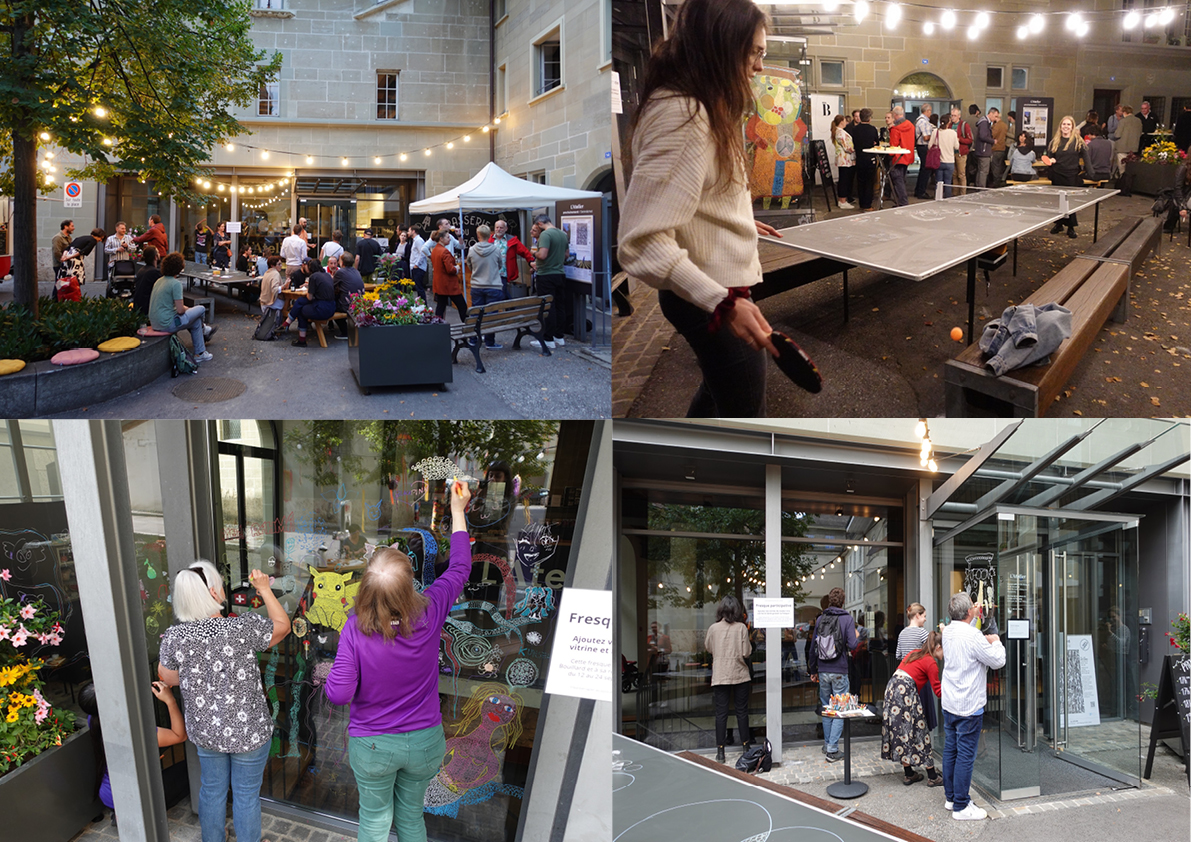 Cet automne, L'Atelier sort de ses murs. L'occasion de réfléchir à l'utilisation de l'espace extérieur en vue de la réaffectation définitive du bâtiment, mais surtout de convier la population du quartier. Ainsi, du mobilier urbain, dont une grande table issue du réemploi et fabriquée par la Ressourcerie, est mis à disposition. Tous les jeudis soirs, des rencontres sont au programme de 17 à 21 heures: fresque participative, projections de films, …. Le tout accompagné par des bières locales (Brasserie du Kybourg, Brasserie du Dzô, Bière de L'Évêque) ou des vins de la Bourgeoisie et de Foodtrucks (Crêpes Fribourg, Taqueria Don Vergas).