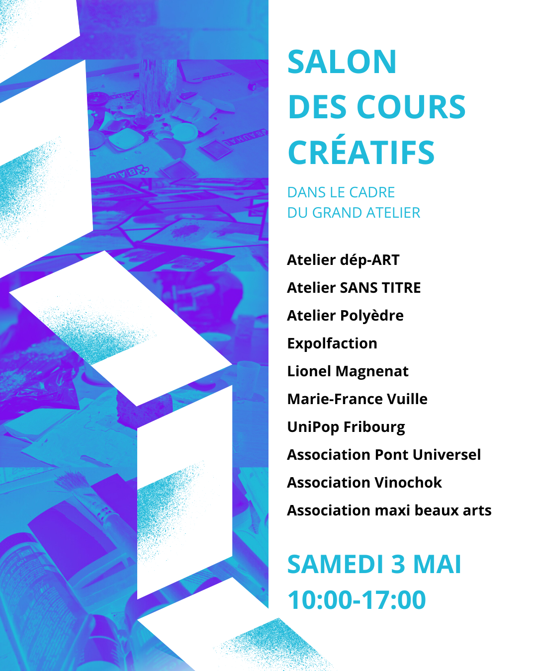 Dans le cadre du Grand Atelier, se tient le samedi 3 mai à L'Atelier un Salon des cours créatifs ! Lors de cette journée, les artistes et enseignants·es d'arts visuels de la ville de Fribourg ont l'opportunité de présenter leurs activités au public. C'est l'occasion pour les visiteurs·ices de venir découvrir l'étendue de l'offre proposée, et de participer à divers moments d'initiation.