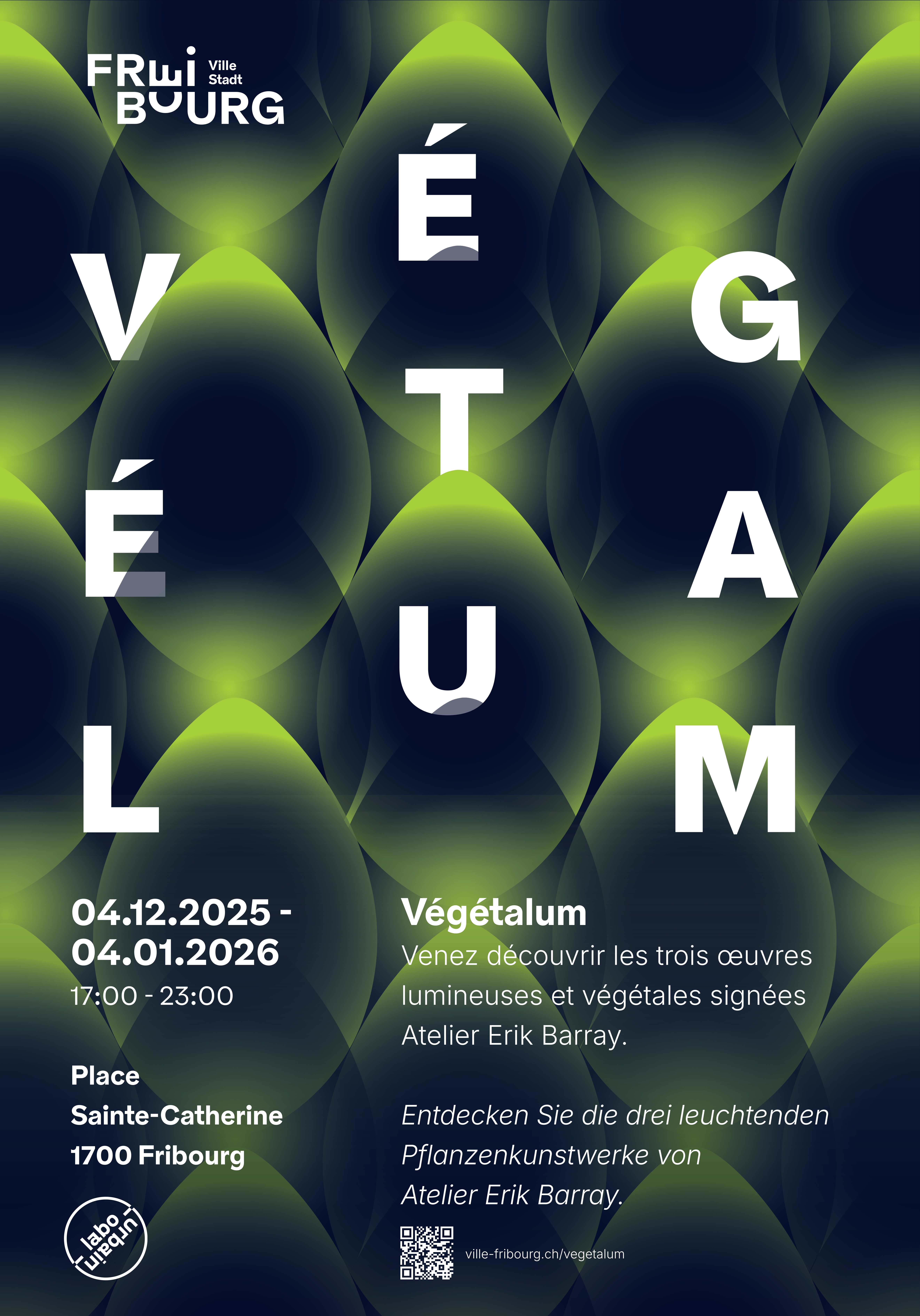 A la Place Sainte-Catherine, un univers féérique prendra vie avec Végétalum, une installation lumineuse signée Atelier Erik Barray. Du 4 décembre 2025 au 4 janvier 2026, chaque soir de 17 à 23 heures, la place se transformera en un écrin végétal et lumineux ; des tressages d’osier et de lumière s’y mêleront pour évoquer la nature, la fragilité et la beauté du vivant. « Tresseur de lumière » reconnu internationalement, Erik Barray a déjà illuminé Lyon, Bruxelles ou Genève. À Fribourg, il mêlera tradition artisanale et création contemporaine pour faire dialoguer la nature et la cité, dans une poésie de l’hiver qui parlera à tous les âges.