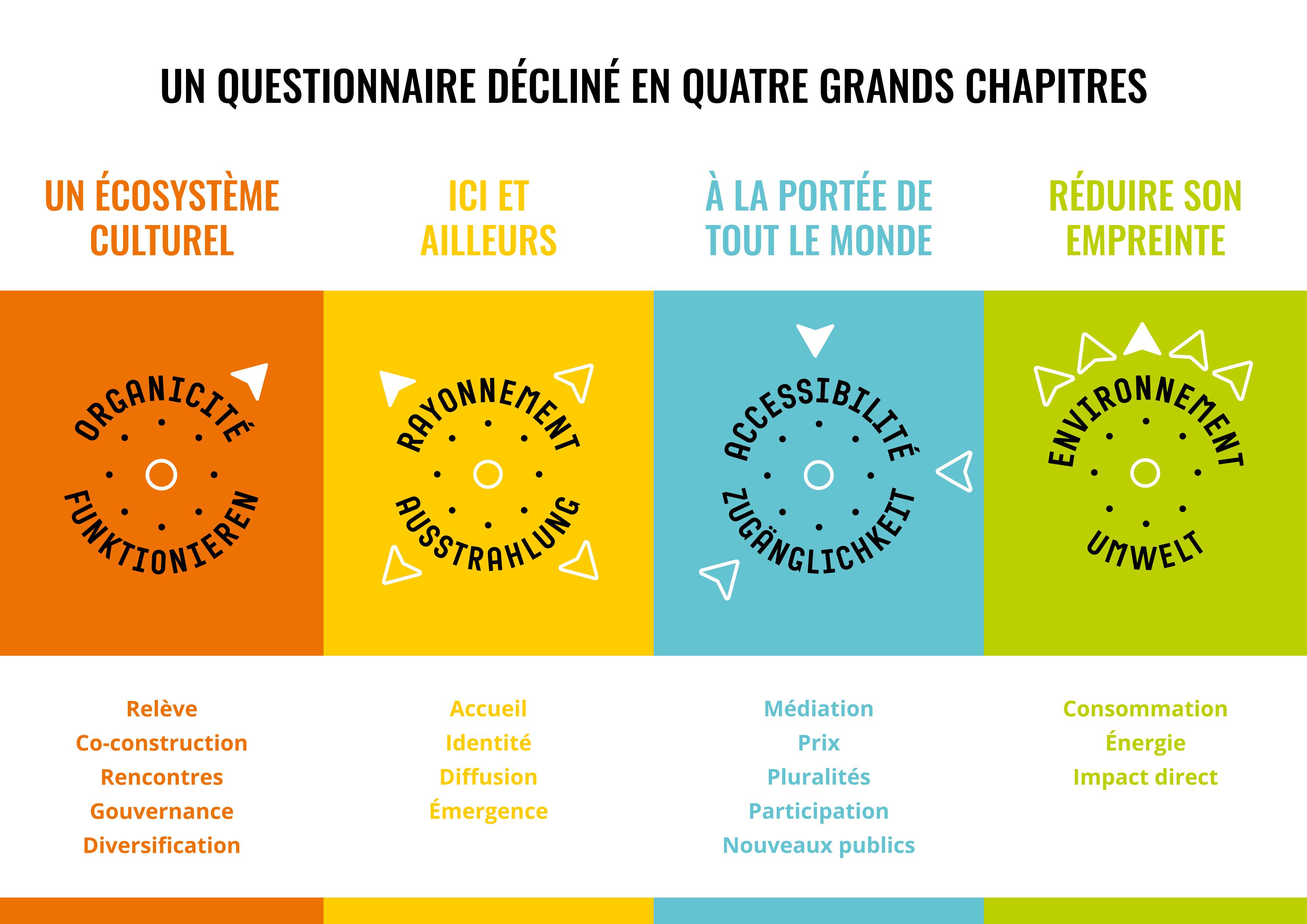 Présentée sous la forme d’un questionnaire décliné en quatre grands chapitres et 17 thématiques, elle se fonde sur la politique culturelle de la Ville de Fribourg, en y intégrant les notions de développement durable et d'interculturalité, liées au champ artistique.