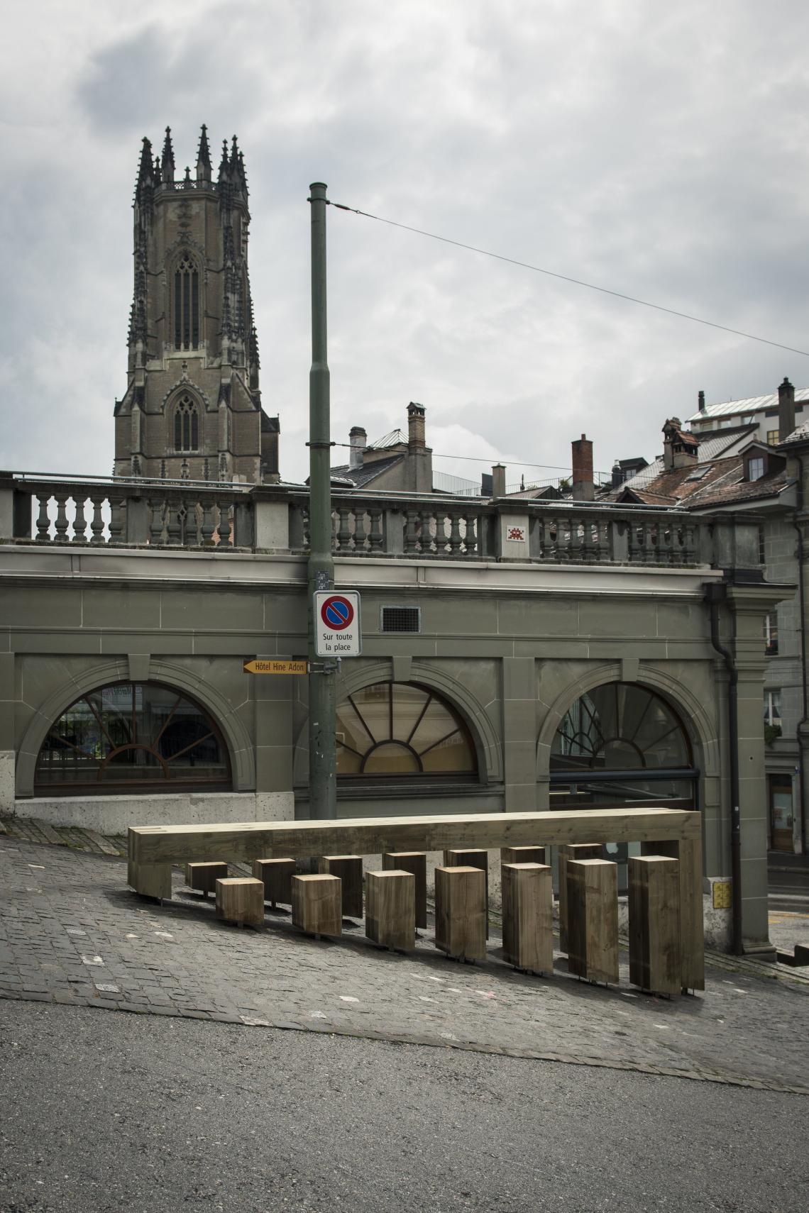 « Fribourg est marquée par sa haute ville et sa basse ville. En implantant le mobilier dans la pente, la table crée un lien entre les citoyens. Ce geste très élancé rassemble et fait référence à la ville des ponts. »