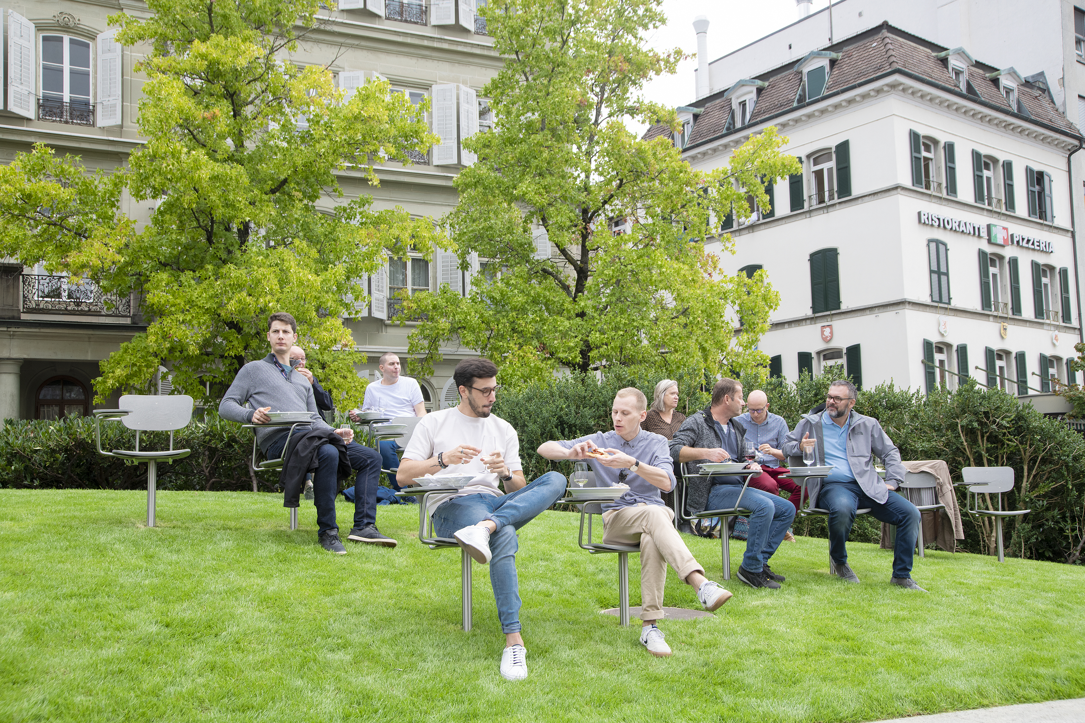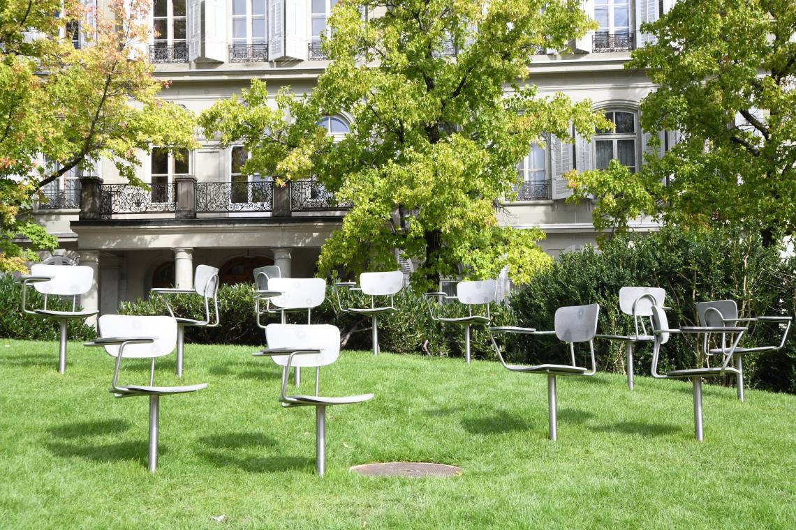 Les chaises sont disposées de façon irrégulière. Le dossier et l’assise sont en Eternit afin de résister aux intempéries. Une écritoire est ajoutée aux chaises afin de pouvoir manger son repas sur la pause de midi, lire un livre au soleil, ou partager un verre avec des amis. Le pied central en métal permet aux chaises de pivoter sur elles-mêmes afin de communiquer entre elles. Il réduit également les points de contact avec le sol. »