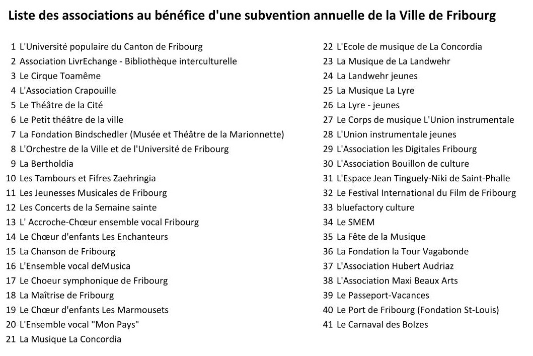 La subvention annuelle représente un soutien pérenne au fonctionnement d’associations culturelles actives durablement en ville de Fribourg et proposant chaque année des animations culturelles sur le territoire communal. La subvention est en principe maintenue d’année en année, sous réserve du respect des contreparties attendues, d’une saine gestion financière et de l’acceptation du budget y relatif par le Conseil général.