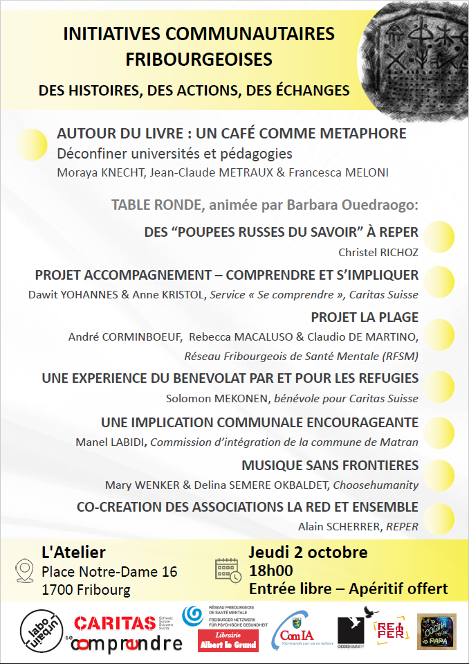 Anlässlich der Veröffentlichung des Sammelbands Un café comme métaphore von Jean-Claude Métraux, Moraya Knecht, Francesca Meloni und zahlreichen weiteren Autorinnen und Autoren laden Caritas Schweiz und der Dolmetscherdienst Se comprendre, das Freiburger Netzwerk für psychische Gesundheit (RFSM), REPER – Promotion de la santé et prévention, Choosehumanity, Com IA – Matr’ensemble pour une vie meilleure das Kulturamt der Stadt Freiburg – Le Labo urbain, die Buchhandlung Albert le Grand und La Cocina de Papa laden Sie zu einer Podiumsdiskussion ein, die am Donnerstag, 2. Oktober 2025, um 18 Uhr im L’Atelier stattfindet.