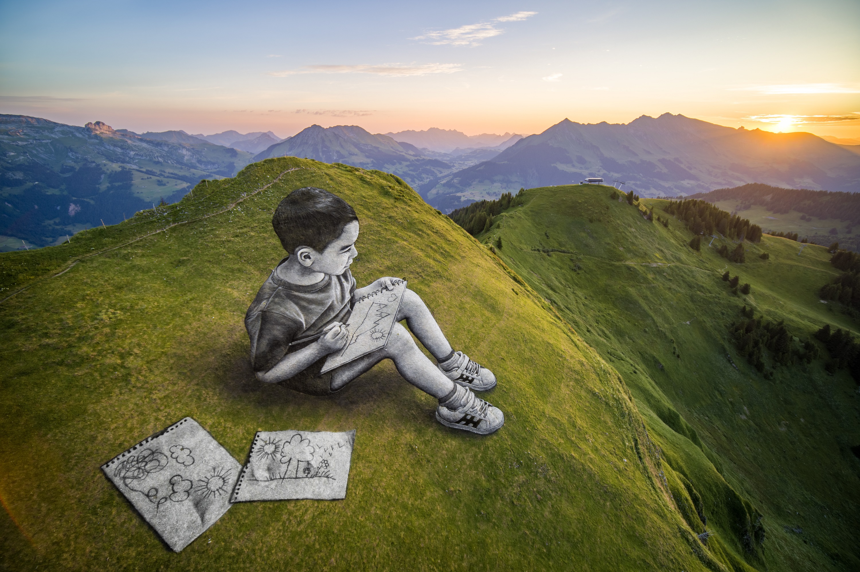 In jedem seiner Werke fängt Saype die Zerbrechlichkeit unserer Gesellschaften und die Herausforderungen, denen wir uns alle stellen müssen, mit Hilfe der monumentalen Fresken ein, die er auf Gras, Erde, Sand und Schnee auf der ganzen Welt anfertigt: New York, Paris, Venedig, Tokio, Genf, Kapstadt, Turin, Nagasaki, Nairobi, Istanbul, Ouagadougou, Miami, (...).