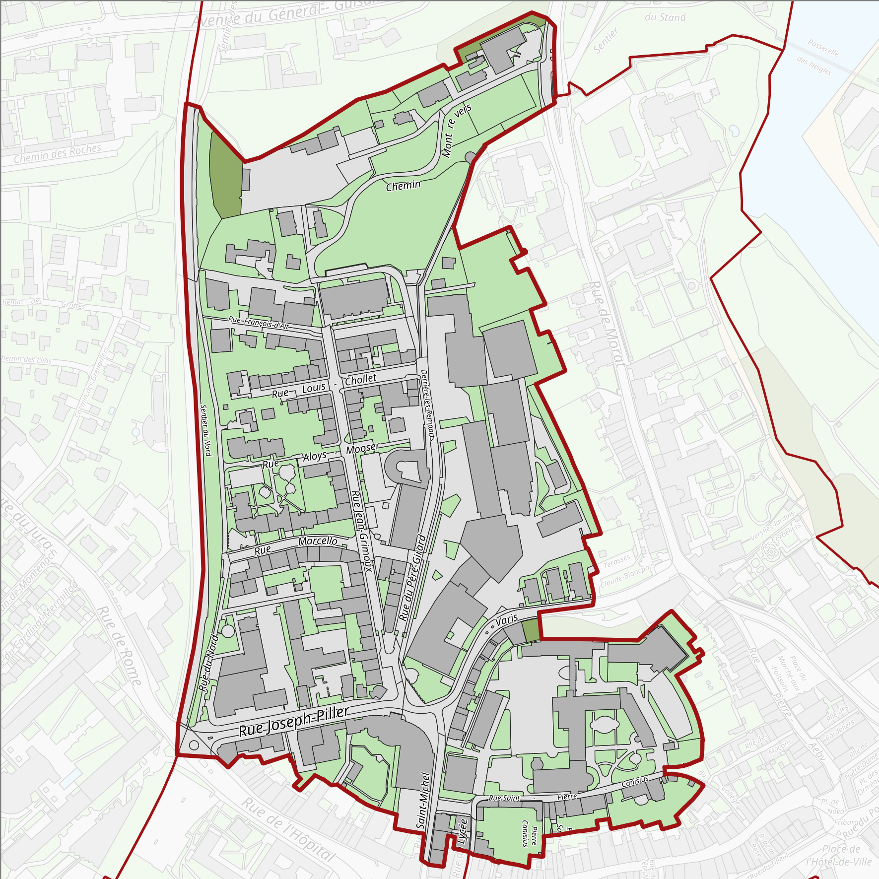 Die Eisenbahnlinie bildete die dritte Grenze des künftigen Altquartiers. Die erste Grenze bildete die noch bestehende Stadtmauer zwischen dem Arsenal des Bollwerks und dem Murtentor, die zweite das Tobel Montrevers. Eine vierte Grenze wurde durch eine Strasse gebildet, die dem Verlauf der alten Stadtmauer zwischen der "Porte des Etangs" und dem Villariaz- oder Aigroz-Turm folgt.
