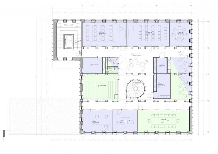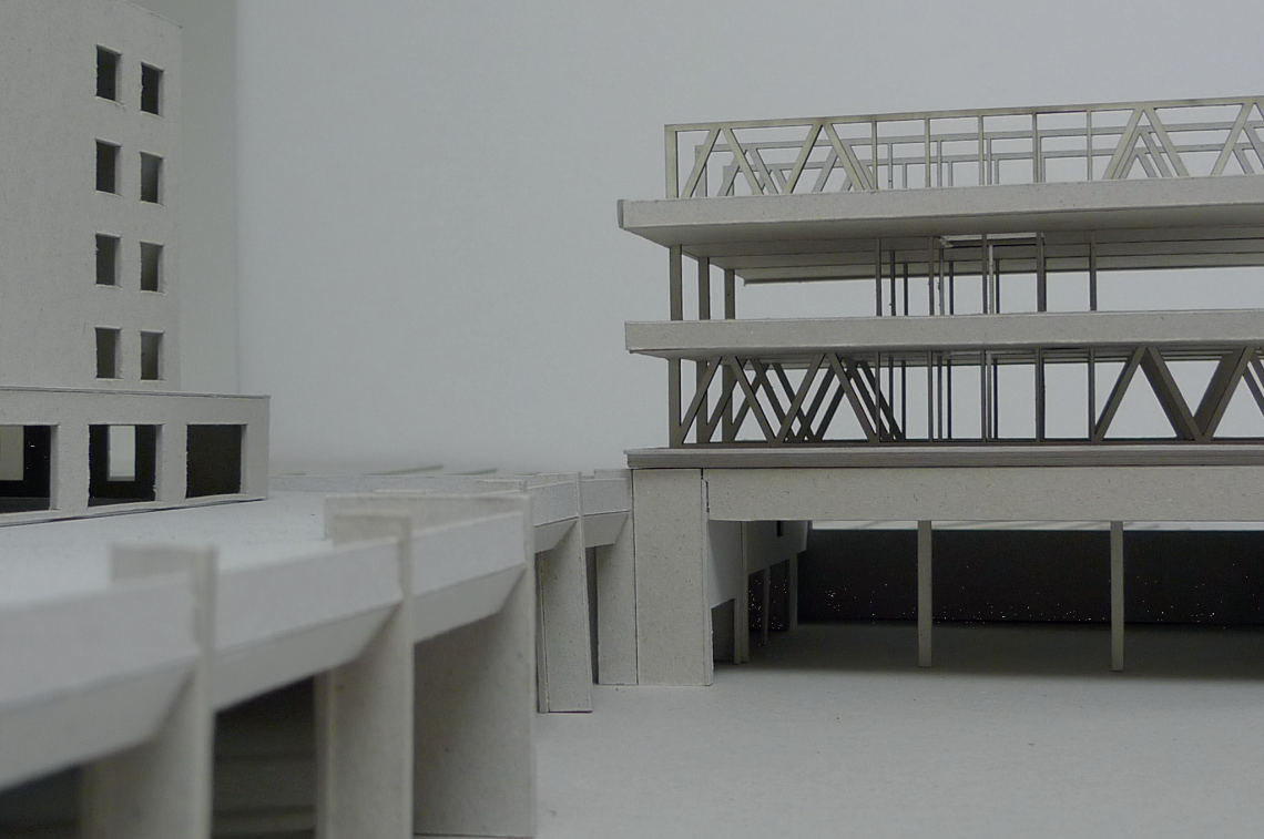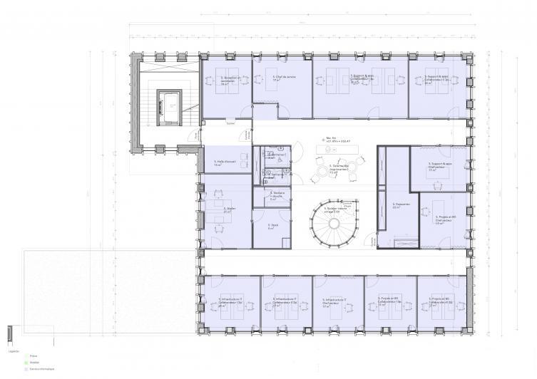 Die Studie hat das Potential einer Aufstockung um 4 Geschosse über dem Dach der Halle bestätigt. Das Programm der Ortspolizei und der Dienststelle für Mobilität werden 3 Geschosse besetzen, das 4. Geschoss ist der Dienststelle für Informatik zugeschrieben. Der Standortwechsel der Ortspolizei und der Dienststelle für Mobilität hat mehrere Vorteile: Er kommt dem Bedarf an Räumlichkeiten der Ortspolizei entgegen und vereinfacht die Leitung einer Direktion, indem all ihre Dienststellen unter ein Dach gebracht werden. Er ermöglicht der Stadt auch die Neuzuteilung der frei gewordenen Räumlichkeiten an der Reichengasse 37. Der Standortwechsel der Dienststelle für Informatik ermöglicht Synergien mit der Ortspolizei und der Feuerwehr und befreit die Räumlichkeiten des Bürgerspitals.