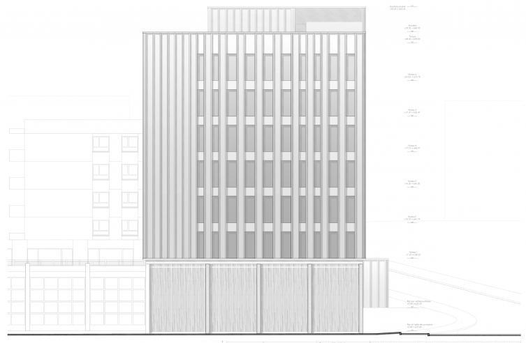 Im Bestreben, sich in die Umgebung einzubetten, wurde auf den Einbau von Edelstahl in die Fassaden gesetzt. Dieses wurde gemäss zwei rohen Eigenschaften eingesetzt: gebürstet für die Hauben der vertikalen Elemente der Fassade und geglüht für die Brüstungen und Spenglereien der Attika. Leicht spiegelnd, reflektiert er den Kontext und integriert so das Gebäude in seine Umgebung. Hinter dieser Auskleidung ist die interne Holzstruktur thermisch abgetrennt, was die Einhaltung hoher energetischer Anforderungen ermöglicht.