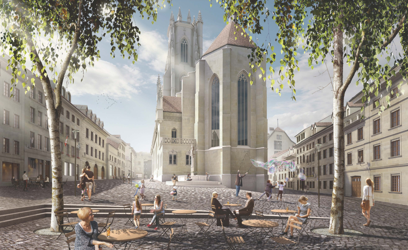 Die bestehende Zufahrt zum Grenette-Parkplatz wird beibehalten. Dies bedeutet, dass der Durchgangsverkehr auf dem Platz aufrechterhalten wird. Die Verkehrsführung soll jedoch möglichst diskret erfolgen und es sind zwei Räume mit einer unterschiedlichen Nutzung geplant: Auf der Kirchenseite wird künftig auf einer grossen Fläche Platz für öffentliche Veranstaltungen geschaffen. Auf der Seite der Kantonalbank wird die Zone durch die Terrasse des Restaurants belebt und durch den Samson-Brunnen aufgewertet.