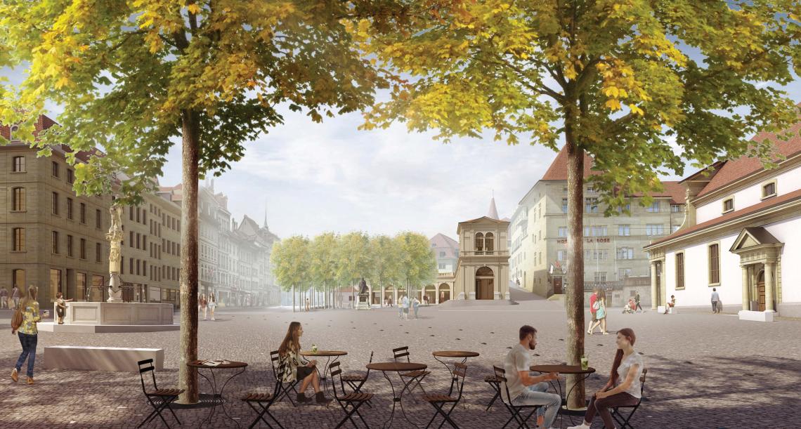 Nachdem der Liebfrauenplatz von den Parkplätzen befreit worden ist, kann dieser neu gestaltet werden. Die rechteckige Form des Raums wird durch die Gebäudefassaden sowie durch die neue Baumbepflanzung auf dem Ulmenplatz klar definiert. Die neue Reihe mit sechs Bäumen vor dem Grenette-Gebäude wird die Terrassen und die Bänke beschatten und die geometrische Form des Platzes verstärken. Der 1957 versetzte Samson-Brunnen wird an seinen ursprünglichen Standort zurückkehren.