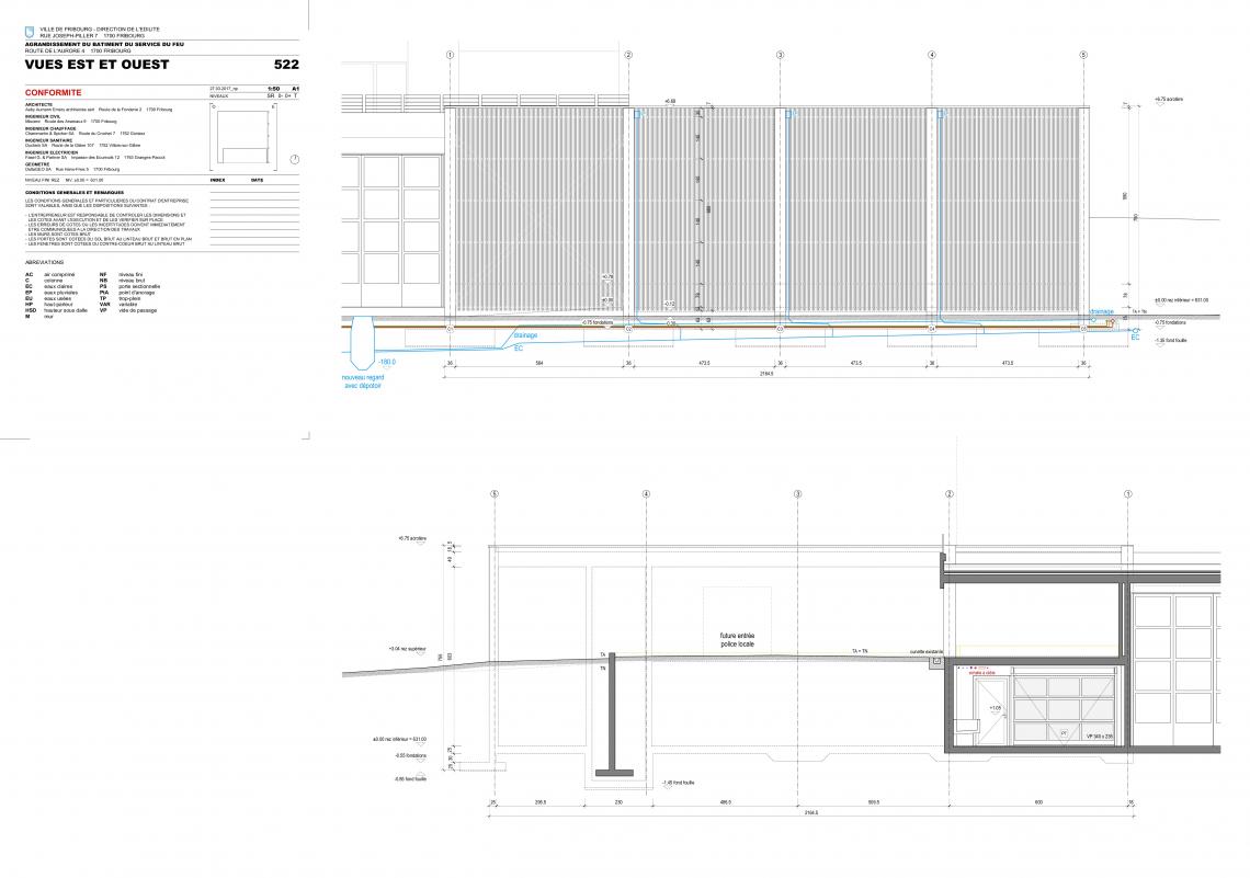 Das Projekt des Büros Aeby Aumann Emery architectes Sàrl besteht aus einem Anbau im Nordosten der Parzelle der Feuerwehrkaserne. Das angefügte Volumen ist eine unabhängige Konstruktion, die mit dem bestehenden Gebäude durch einen tieferen Teil verbunden ist. Das mit Regalen ausgestattete Materiallager wurde als offener Raum konzipiert, der einzig durch sein Mobiliar definiert wird und befindet sich im hinteren Teil der Halle. Dieser Eingriff neben dem bestehenden Gebäude erlaubte es, dessen normalen Betrieb während den ganzen Bauarbeiten beizubehalten und den permanenten Notfalldienst aufrechtzuerhalten.