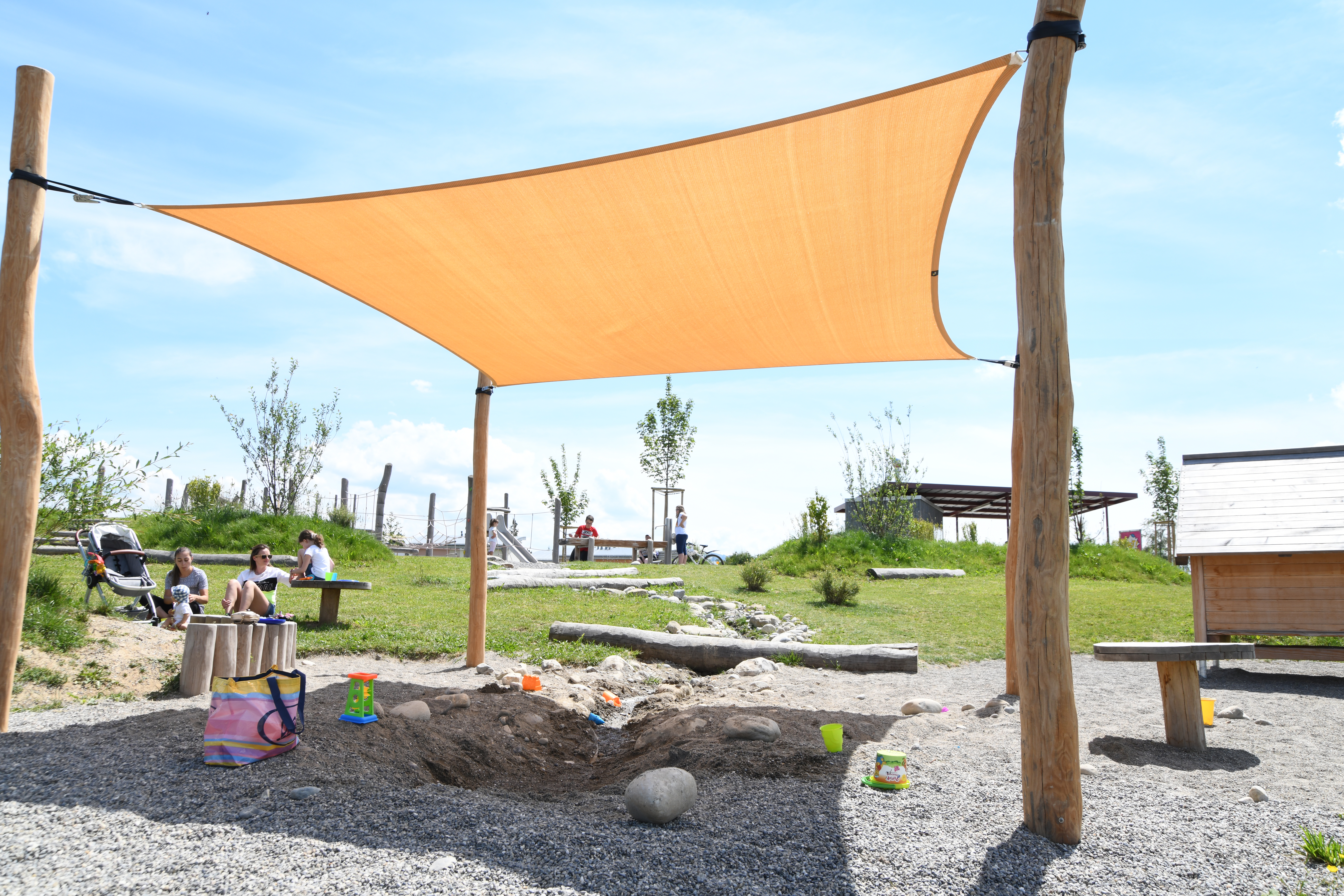 Der bestehende Spielplatz wurde vergrössert und der Park mit einer Wasserpumpe und einem Abflussweg sowie einer Schaukel in Form eines Vogelnestes naturnaher gestaltet. Bäume und ein Sonnensegel spenden Schatten. Mittelfristig wird eine grosse Rasenfläche zur Verfügung stehen, um Ball zu spielen, Yoga zu üben oder ganz einfach zu entspannen. Der Park verfügt überdies über eine Begegnungszone mit Picknicktischen und einem Grill sowie einem Unterstand in unmittelbarer Nähe mit neuen ökologischen WC-Anlagen. Zudem steht Personen mit eingeschränkter Mobilität ein Haltebereich zur Verfügung.