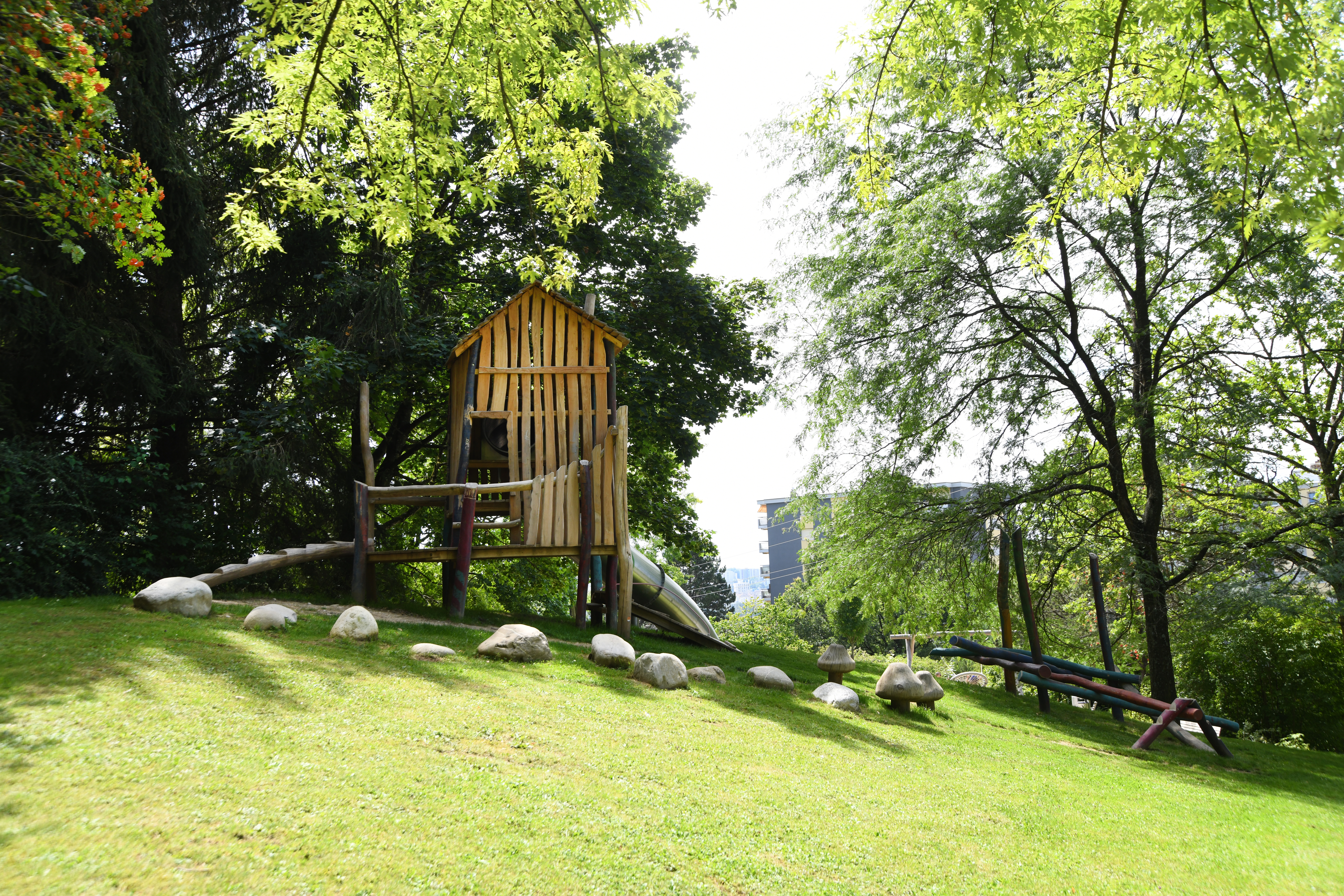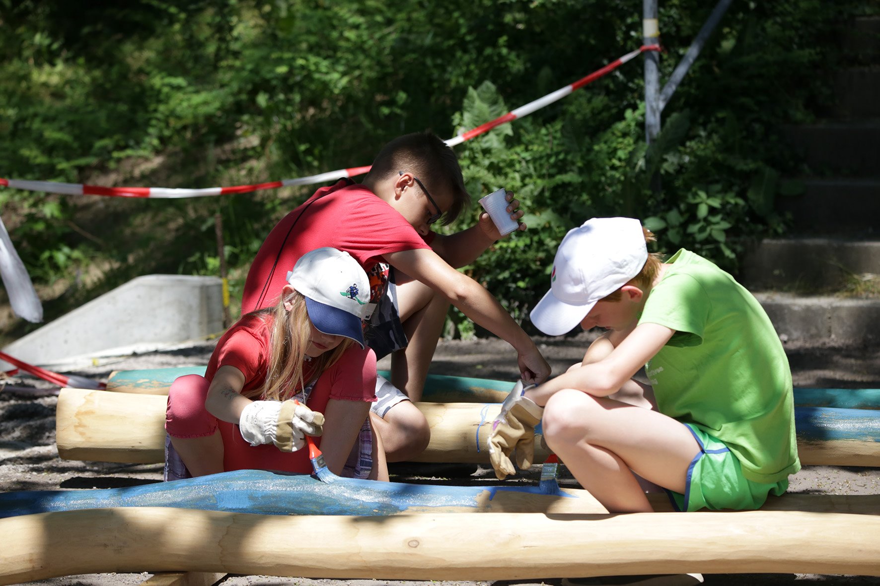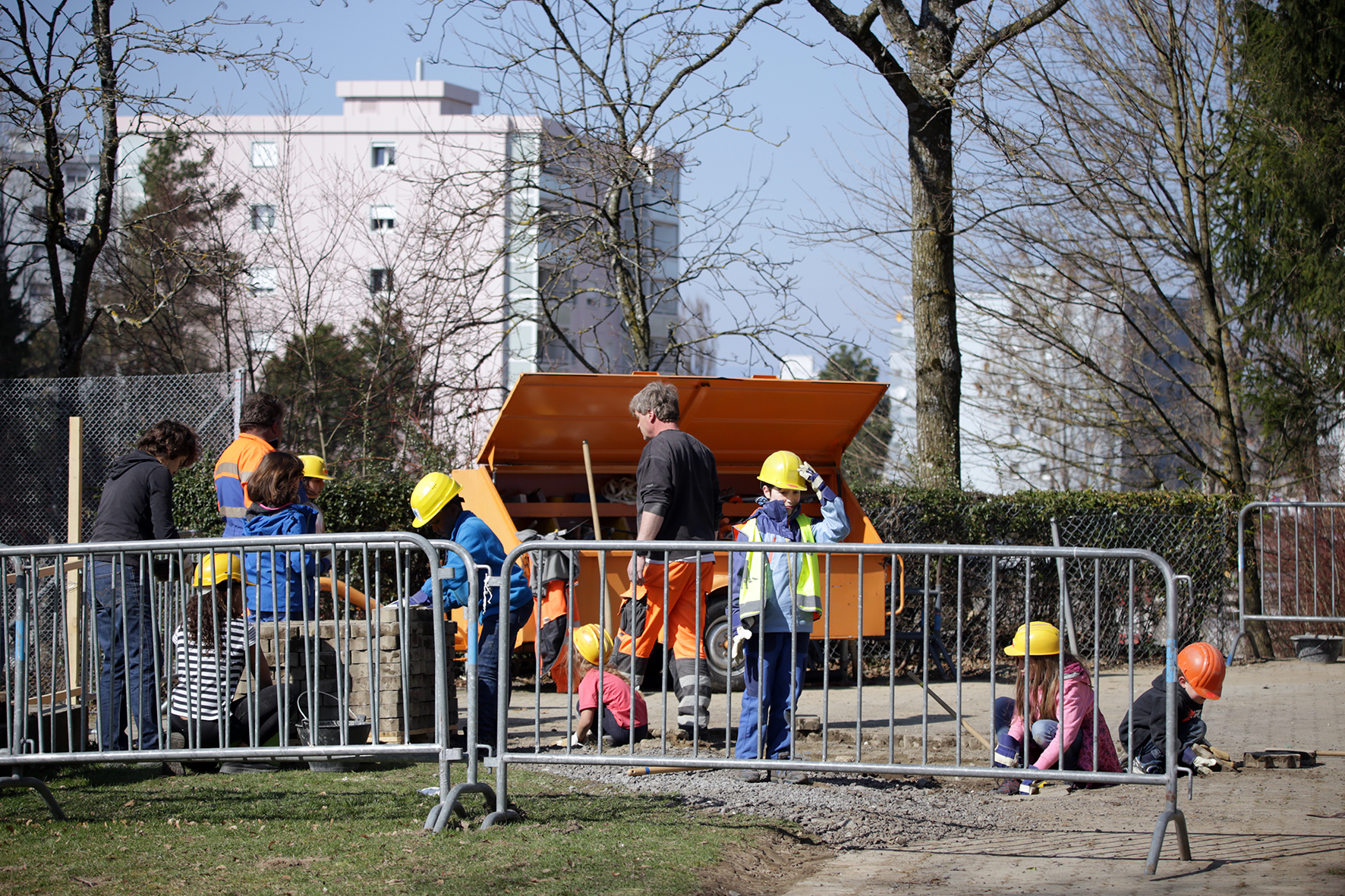Während der Bauphase konnten die Schülerinnen und Schüler mithelfen, das Pflaster des Platzes aufzureissen, Baumstümpfe, die ein riesiges Mikado bilden, anzumalen, Sträucher, Erdbeeren und Blumenzwiebeln zu pflanzen. Auf diese Weise konnten sie ihren künftigen Spielplatz bereits ein wenig in Besitz nehmen.
